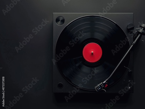 A black record player with a red label on it. The record is not playing