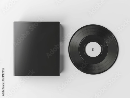 A black record sits on a white background next to a black box. The record is a vinyl and the box is a CD case