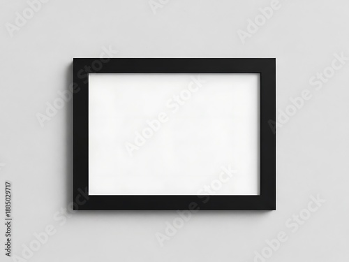 A black rectangular frame hangs on a gray wall, viewed from the front, showcasing its empty interior.