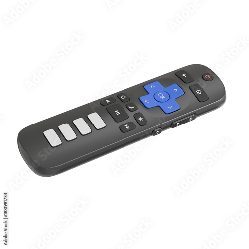 a black remote control with blue directional pad and white buttons, angled side view, for modern tech product showcasing and mockup.