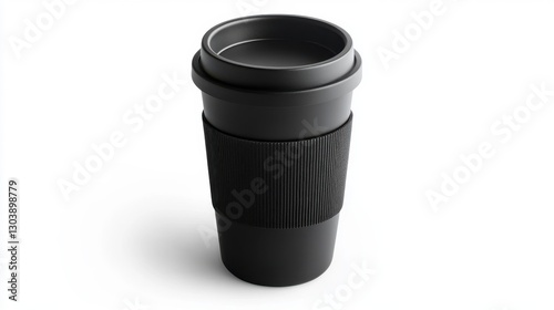A black reusable coffee cup with a textured sleeve is shown