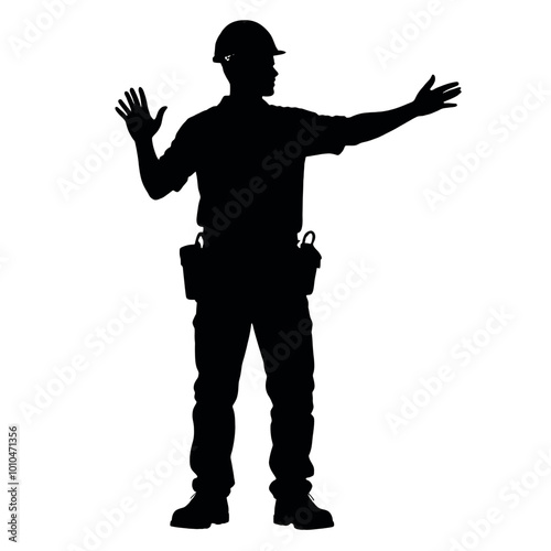 a black silhouette of a construction worker. The worker is standing with his arms stretched out to the sides and his hands raised in the air