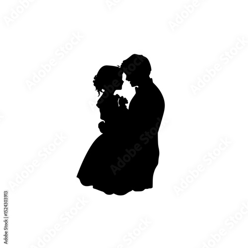 a black silhouette of a man and woman kissing a bride, icon isolated on white background black, bride, couple, groom, icon, kiss, man, people, silhouette, wedding couple, woman , Generative art.