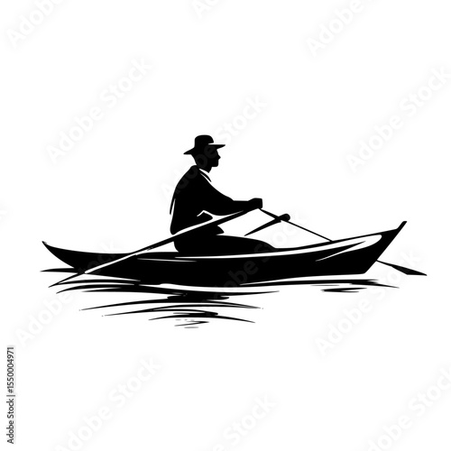 a black silhouette of a man in a hat rowing a boat black, boat, hat, man, row, silhouette, water , Generative art.