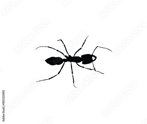 A black silhouette of an ant insect viewed from above, isolated on a plain white background.