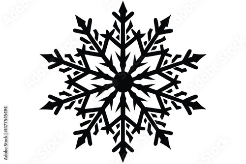 A black snowflake with intricate patterns stands out against a plain white background clearly