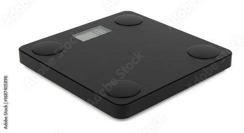 A black square digital bathroom scale with a small display screen and four rubber feet.