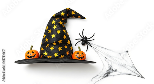 A black star patterned witch hat with two pumpkins and a spider web on a white surface background