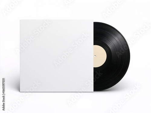 A black vinyl record partially placed in a blank white sleeve. A classic music mockup with customizable space.