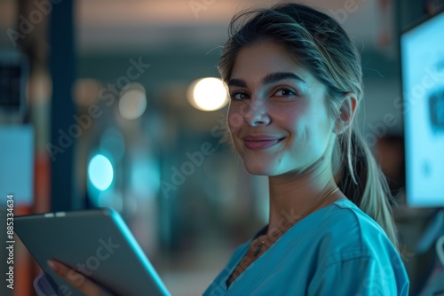 A black woman in a hospital using a tablet to research, conduct online consultations, or conduct medical research. Medical, healthcare and an evening physician with wellness technology in a clinic.