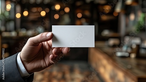 A blank business card being held by a person, with a soft-focus background, representing a professional exchange of information