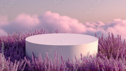 A blank, round, white pedestal sits amidst a field of vibrant purple lavender flowers, set against a backdrop of soft pink clouds.