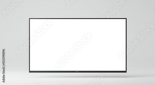 A blank, widescreen television floats against a minimalist grey backdrop.