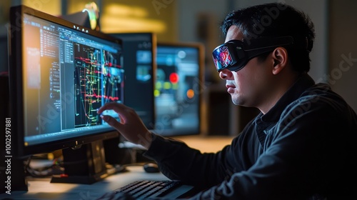 A blind or visually impaired engineer working on a computer, designing innovative solutions with assistive tech at their fingertips.
