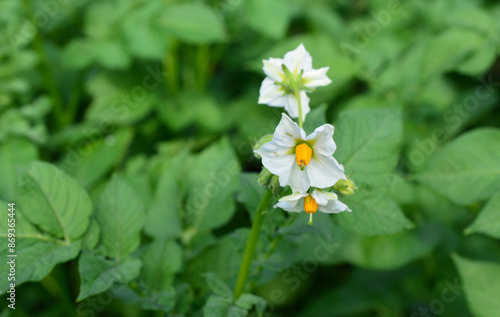 a blooming potato plant on the potato field close up