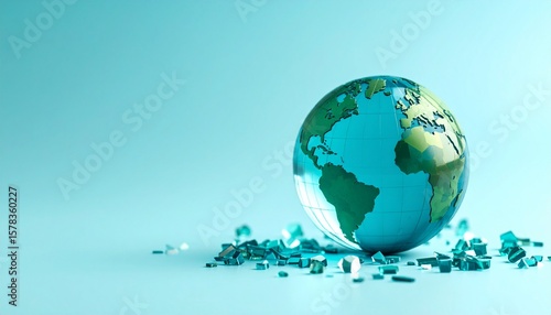 A blue and green translucent pixel globe on a background, with pieces flying around it