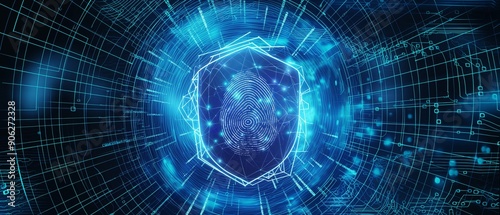 A blue and white image of a computer screen with a blue shield in the middle. Digital security background. Hologram digital security