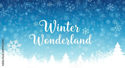 A blue and white winter scene with snowflakes and trees
