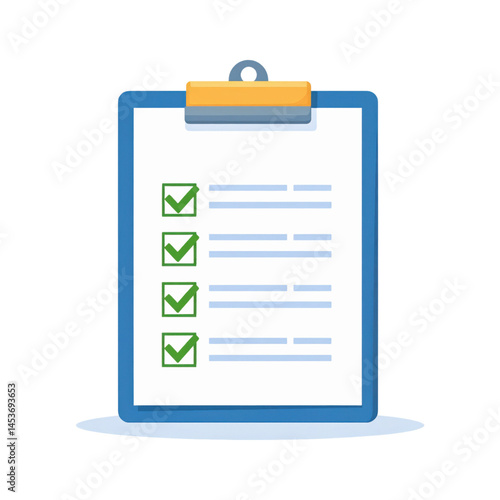 A blue clipboard displaying a checklist with four green checkmarks and lines indicating completed tasks.