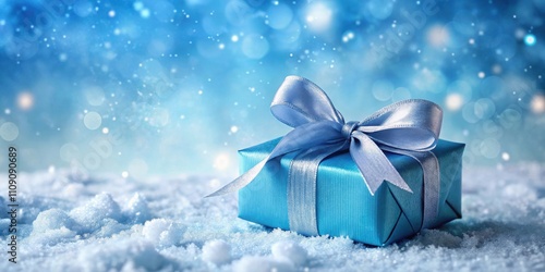A Blue Gift Box Decorated with a Silver Bow Rests on a Blanket of Sparkling Snow