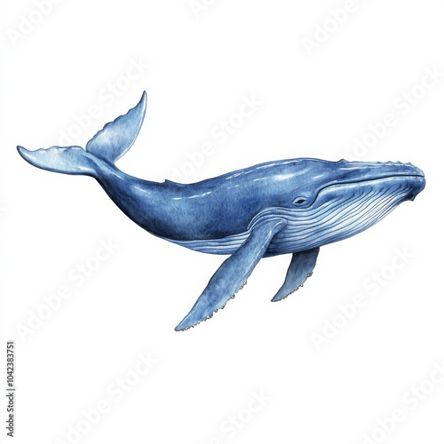A blue whale gracefully swimming in the ocean, hand-painted in watercolor, isolated on a white background. The majestic sea creature showcases the beauty and scale of the marine world, perfect for