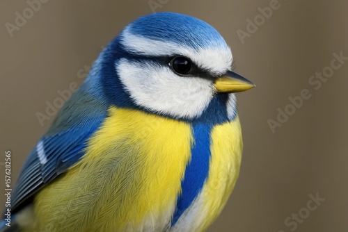 A blue-and-yellow bird perches on a blurred backdrop, its gaze steady and serene