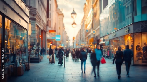 A blurred background of a shopping street in the city with people walking, perfect for retail and urban lifestyle themes.