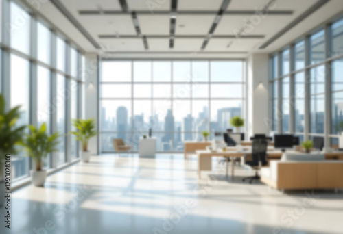 A blurred modern office interior with panoramic windows and soft natural lighting. A minimalistic, bright workspace with an airy and professional atmosphere.