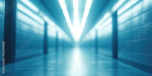 A blurred perspective of a futuristic hallway with bright lights and a serene atmosphere, creating a sense of depth and tranquility.