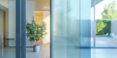 A blurred photograph showcases a modern interior with expansive glass doors leading to an outdoor patio. The glass panes create a layered effect, revealing glimpses of a lush green garden