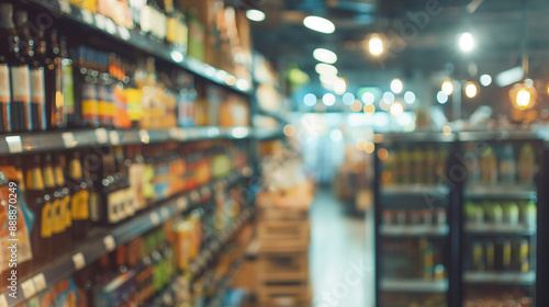 A blurred view of a supermarket aisle filled with various products on shelves, showcasing a busy retail environment, with diverse groceries and goods for sale under fluorescent lighting