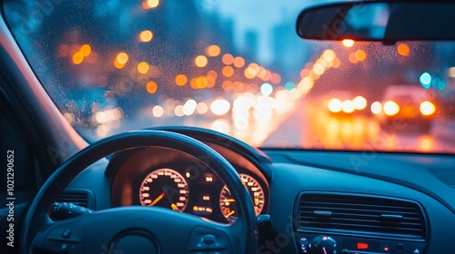 A blurry image captures the interior of a car, with bokeh lights from streetlights creating a dreamy effect.