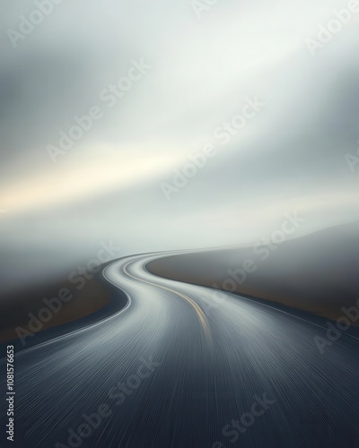 A blurry road with a misty sky in the background