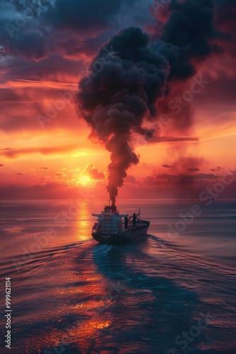 A boat on the ocean with smoke coming out, perfect for representing pollution or environmental concerns