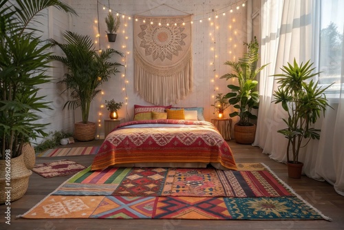 A bohemian-style bedroom, colorful patterned rugs, macramé wall art, string lights glowing warmly,