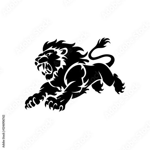 A bold black and white vector illustration of a roaring lion in mid-leap, showcasing its fierce expression, muscular body, and sharp claws.