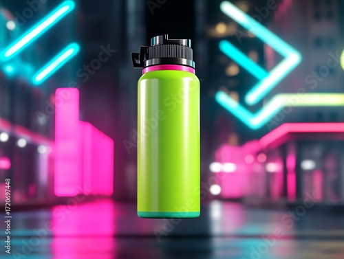 A bold green hair dye spray can, suspended midair in a glowing artistic environment with neon highlights