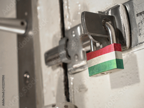 A bolted door secured by a padlock with the national flag of Hungary on it.(series)