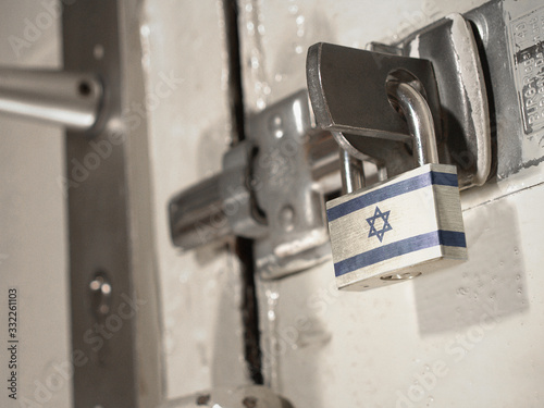 A bolted door secured by a padlock with the national flag of Israel on it.(series)