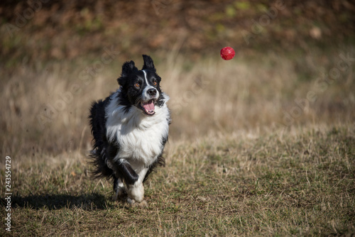 A border collie is running after a red ball