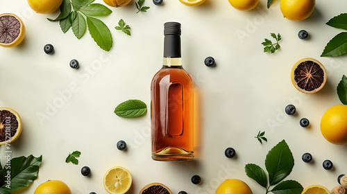 a bottle of amber alcoholic drink surrounded by fresh citrus fruits and berries on a light background. Concept: context of gastronomy, beverage advertising, healthy lifestyle, cooking and festive even