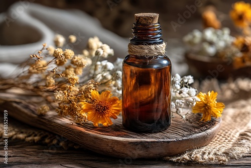 A bottle of essential oil sits on a wooden table with dried flowers