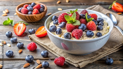 A bowl of creamy oatmeal topped with fresh blueberries and raspberries, a burst of vibrant colors and flavors for a wholesome breakfast
