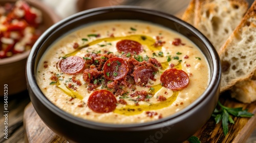 A bowl of creamy soup topped with sliced pepperoni, herbs, and olive oil, served with bread.