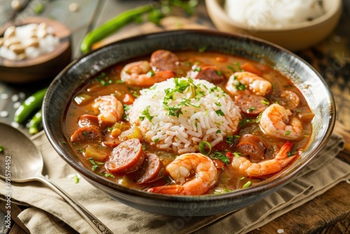 A bowl of gumbo, a hearty stew with shrimp, sausage, okra, and spices, served with a scoop of white rice.