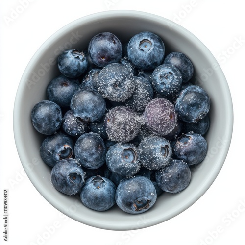 A bowl of ripe blueberries with a sprinkle of sugar, isolated white background, modern art style