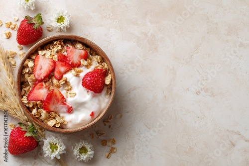 A bowl of yogurt with sliced strawberries and granola placed beside wheat stalks flowers and loose granola on a beige surface