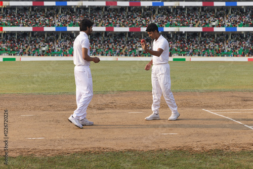 A bowler inspects the pitch while the captain stands behind during a cricket game