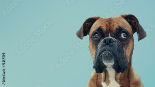 A Boxer dog with expressive eyes stands against a light blue background, showcasing its unique features and personality while providing ample copy space for text or branding.