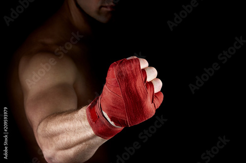 A boxer's red bandage on his hand isolated on dark blurred background, close-up.